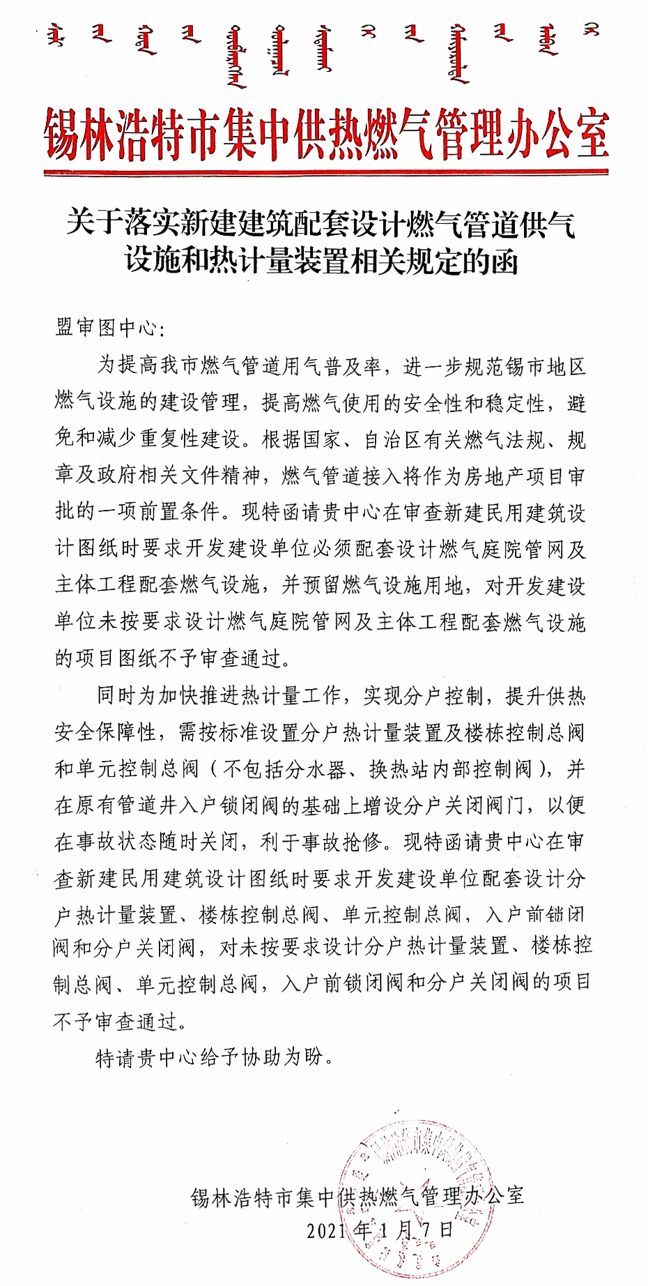 (锡供热办)关于落实新建建筑配套设计燃气管道供气设施和热计量装置相关规