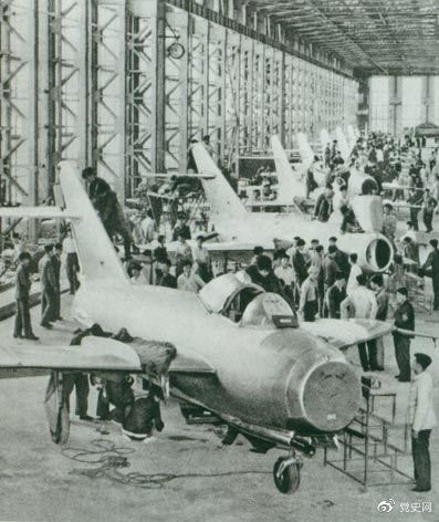1956年7月19日,国产第一架喷气式战斗机在沈阳首次试飞成功,标志着中国具备了独立研制空军武器装备的能力。图为国产第一批喷气式飞机即将出厂。